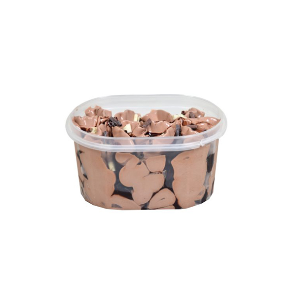 ITALIANO: Gelato cremoso al gusto di cioccolato, variegato con crema di cioccolato fondente e decorato con riccioli di cioccolato.